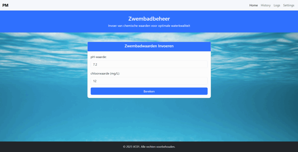 We werkten met vijf studenten samen om een systeem te ontwerpen dat de gebruiker toelaat om manueel de gemeten waarden van het zwembad in te voeren via een gebruiksvriendelijke webinterface. Op basis van die input berekent het systeem automatisch welke correcties nodig zijn, en stuurt het een pompensysteem aan dat de juiste hoeveelheid chemicaliën toevoegt aan het zwembadwater.
